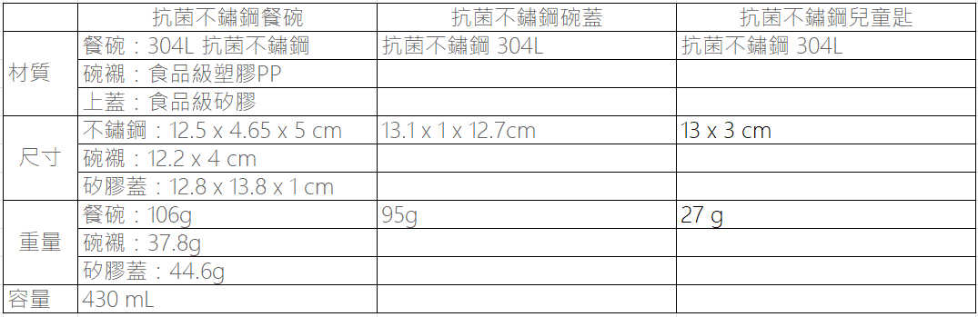 此組合包含:Soufflé 抗菌不鏽鋼餐碗*3、Soufflé 抗菌不鏽鋼兒童匙*3、Soufflé 抗菌不鏽鋼碗蓋*3。