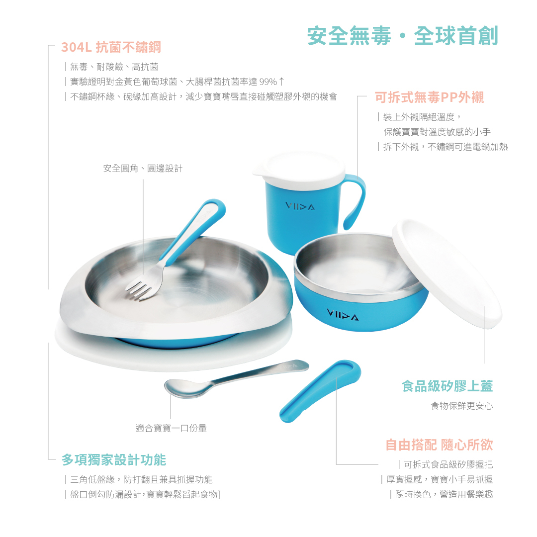| 材質 | 杯/碗/盤/叉匙:抗菌不鏽鋼304L 上蓋、握柄:食品級矽膠 碗/杯/盤襯:食品級塑膠PP | ||