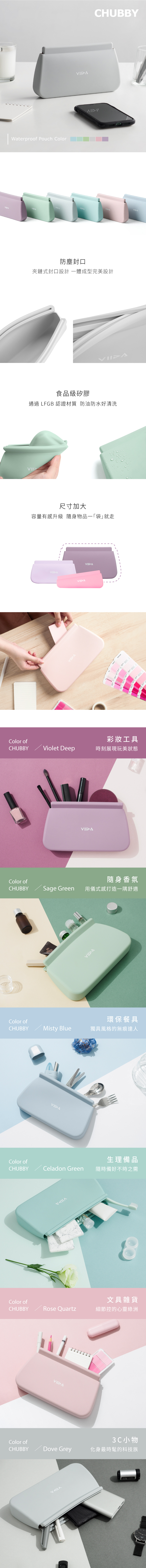 VIIDA Chubby防水收納袋:多款款顏色、使用100%食品級矽膠、通過LFGB認證 、一體成型設計、夾鏈式防塵封口、防油防水、清潔簡單方便、容量有感升級,將各類小物分門別類的最佳幫手,時尚的收納袋是你外出或旅行的好伴侶!