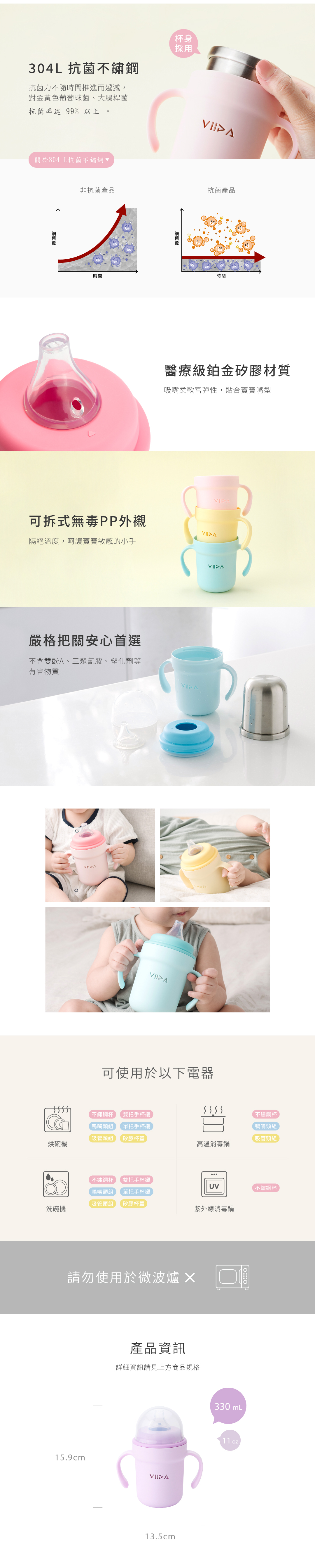 | 材質 | 學習杯:抗菌不鏽鋼304L 學習杯外襯:食品級塑膠PP 鴨嘴座:食品級鉑金矽膠 | ||